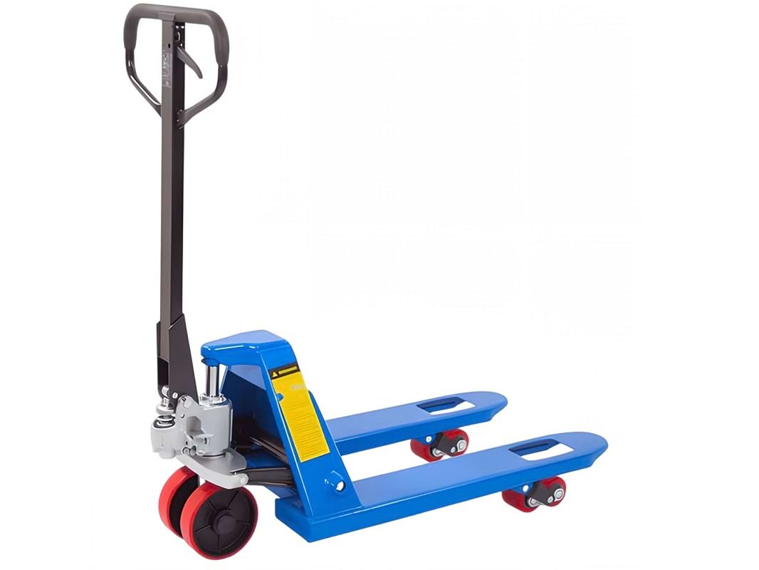 Тележка изготовлена из высокопрочного металла, устойчивого к различным погодным условиям, что позволяет использовать её не только в пределах склада, но и на открытом воздухе. Вилы дополнительно усилены по всей рабочей зоне, что придаёт технике прочность и предохраняет их от деформации, позволяя работать с грузом в интенсивном режиме.