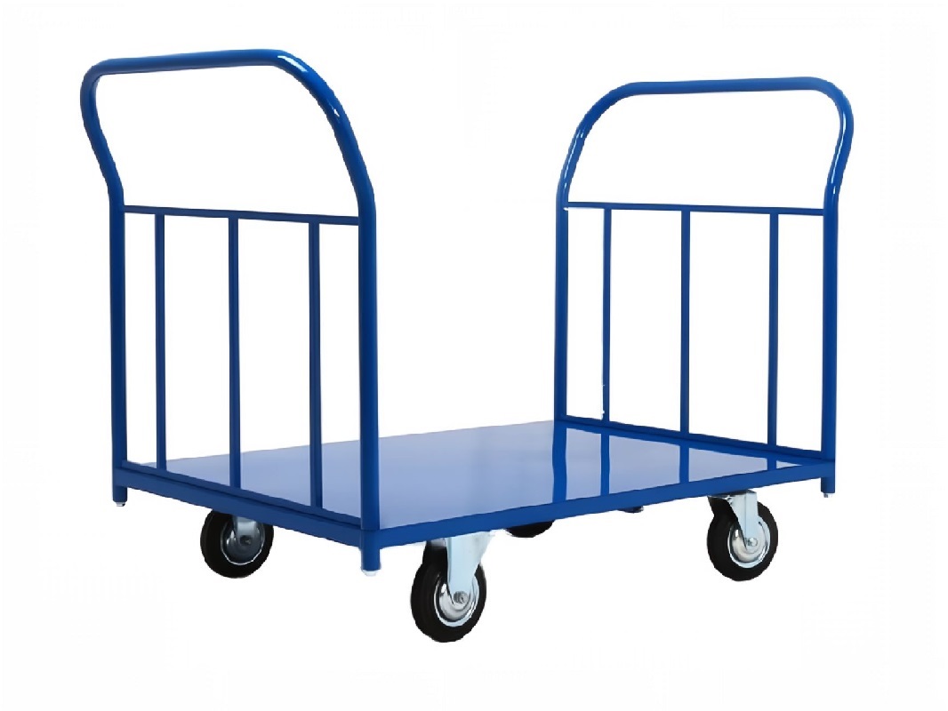 Используется промышленная серия колёс, в комплекте идут метизы для фиксации колёс и ручки. Каркас выполнен из труб круглого сечения, что гарантирует высокую прочность изделия. Настил – металлический лист. Бортики отсутствуют, а значит, можно перевозить товары нестандартных размеров. Может быть укомплектована поворотными и неповоротными колёсами. Площадка для крепления колёс универсальная. Ручки расположены на высоте, удобной и безопасной для работы сотрудников. Подходит для использования на складе, производстве, в магазине и т.д. Благодаря полимерному окрашиванию ее можно эксплуатировать при любых погодных условиях. Рекомендуется перемещать по твердой ровной поверхности.