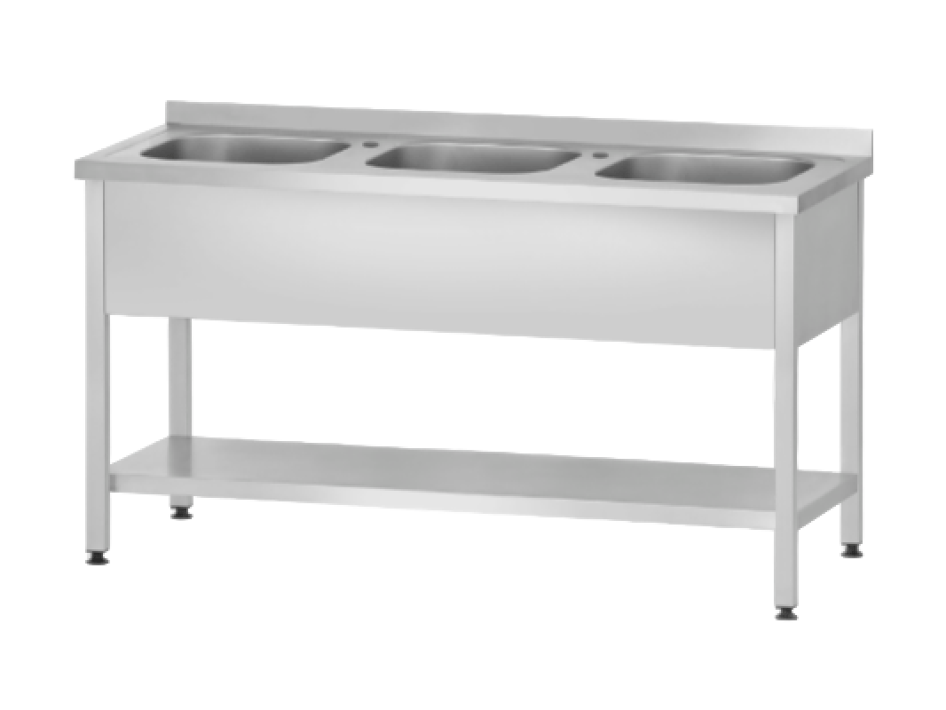 Имеет три моечных отделения, поставляется в двух размерах 1800х600х860 и 1800х700х860 мм с объёмным бортом в 60 мм. Два отверстия для установки смесителя, если нет необходимости в нем, продается отдельно специальная заглушка. В стандартную комплектацию входят ножки с возможностью регулировки высоты.