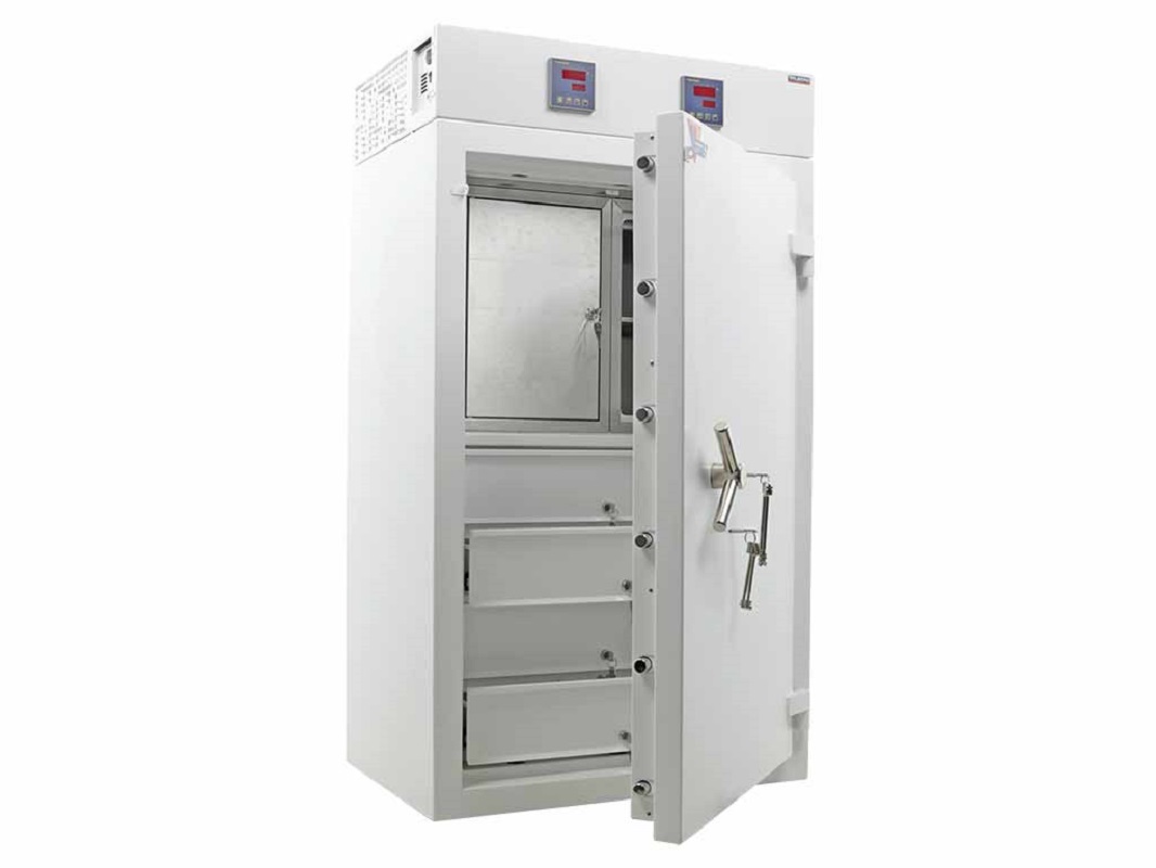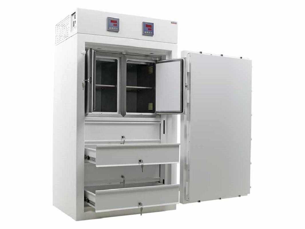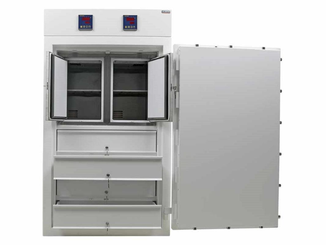 В медицинской сфере применяют специализированные сейфы-холодильники (термостаты) для сохранения препаратов и лекарств в соответствии с постановлением Правительства РФ No1148 от 31.12.2009 г. «О порядке хранения наркотических и психотропных веществ». Сочетают в себе технически грамотное и безопасное сохранение лекарственных средств. Взломостойкость соответствует требованиям ГОСТ Р 57266-2016. Отличается большими габаритами, оснащен двумя термостатами и четырьмя ящиками.