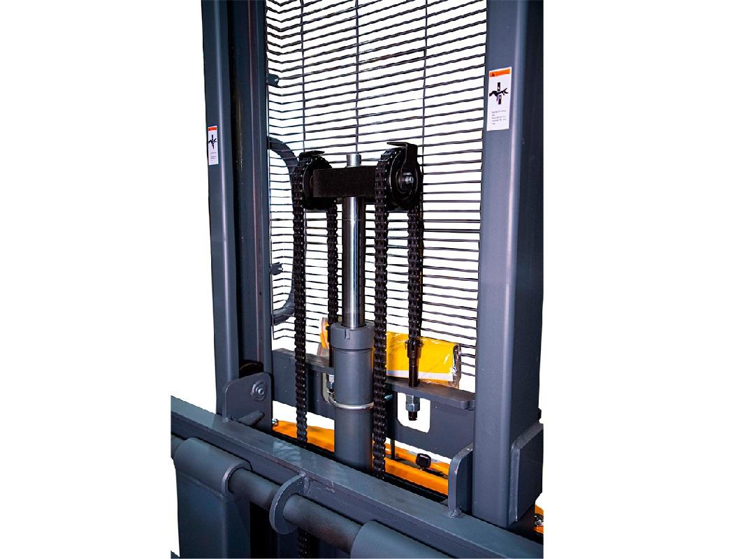 Этот маневренный штабелер способен работать в стесненных условиях. Он имеет прочную стальную конструкцию мачты, сварные вилы и мощную гидросистему. Безопасность оператора обеспечивается сетчатым экраном, который защищает его от подъемных цепей. Тормозная система и колёса также защищены кожухом.
