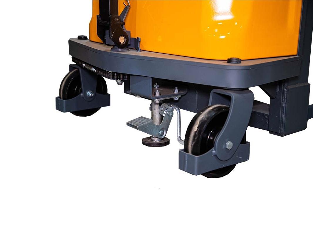 Этот маневренный штабелер способен работать в стесненных условиях. Он имеет прочную стальную конструкцию мачты, сварные вилы и мощную гидросистему. Безопасность оператора обеспечивается сетчатым экраном, который защищает его от подъемных цепей. Тормозная система и колёса также защищены кожухом.