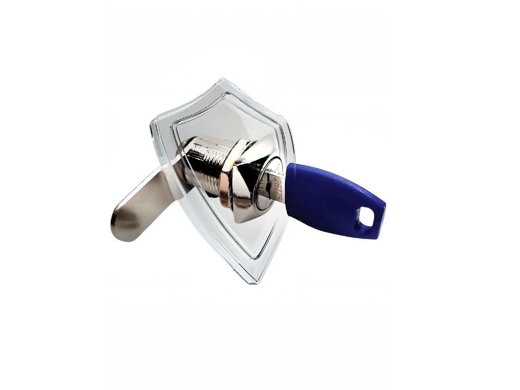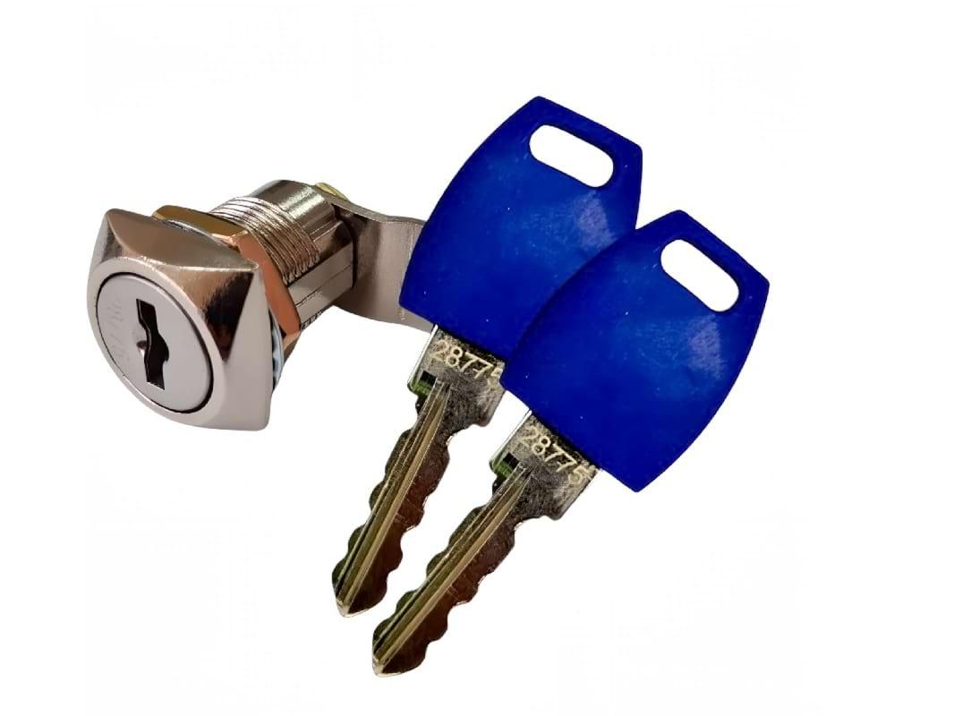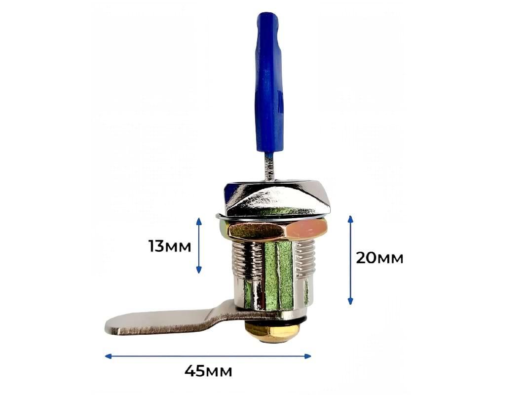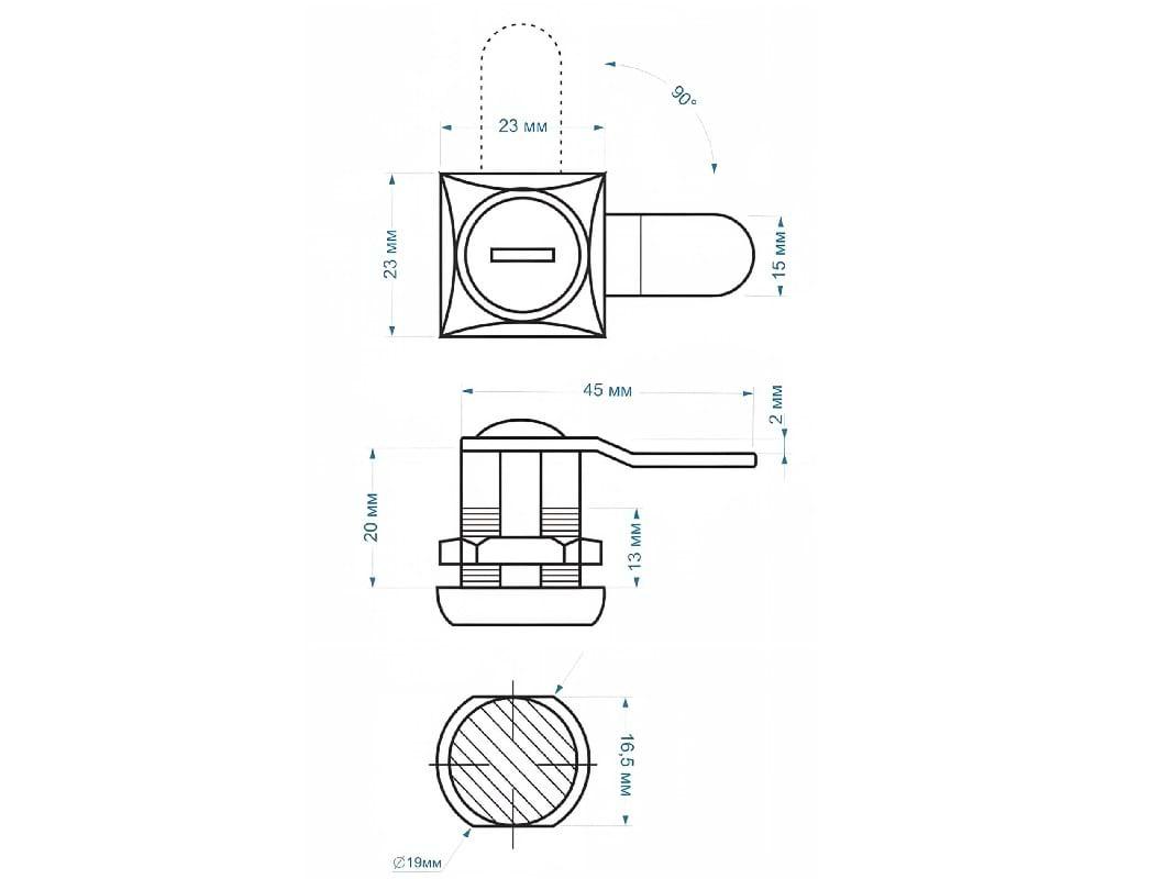 В комплект входит сам замок и два ключа. Диаметр барабана составляет 19 мм, угол поворота ключа — 90 градусов. Замок с повышенной секретностью 1:1000 с изогнутым ригелем длинной 45 мм.